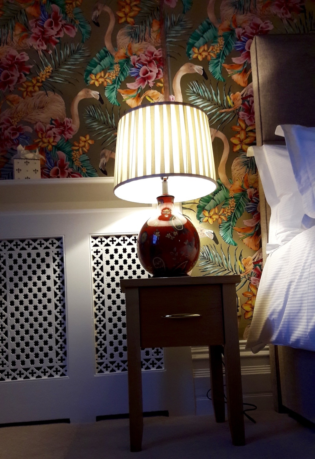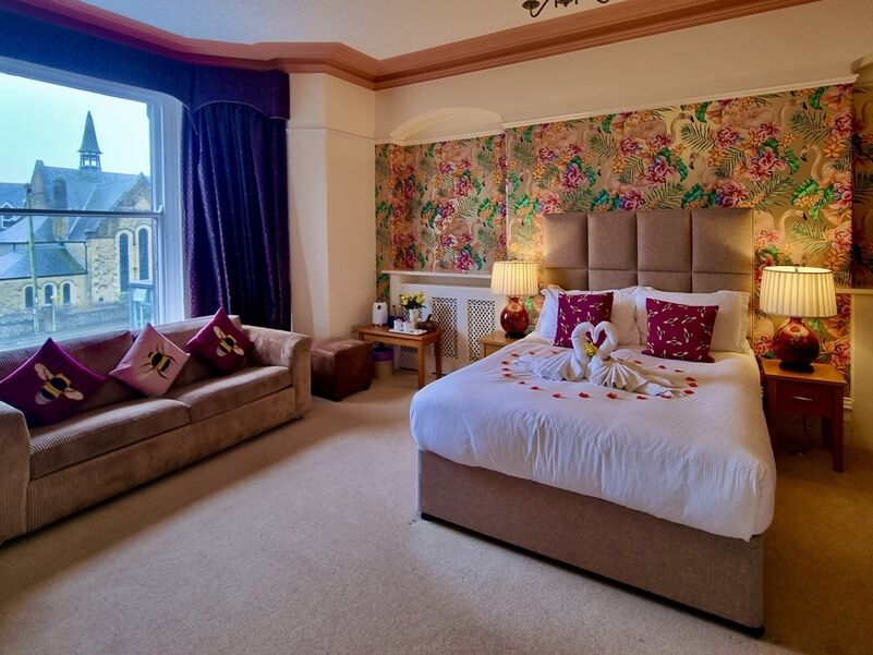 Once the original Front Parlour, this elegant and character filled room features our signature Wild Flamingo wallpaper, a king size bed, and a luxurious ensuite bathroom with walk in shower. Relax in the cosy sofa area in front of the bay window and enjoy modern touches such as a flatscreen Smart TV and complimentary WiFi.