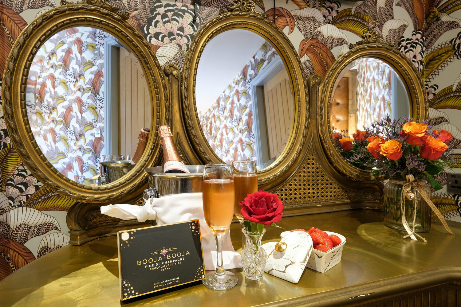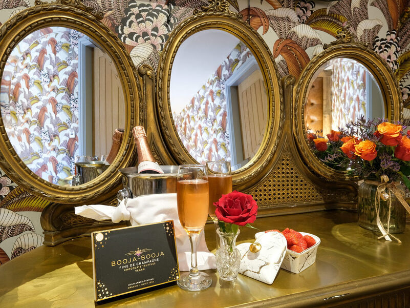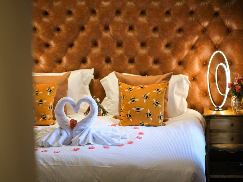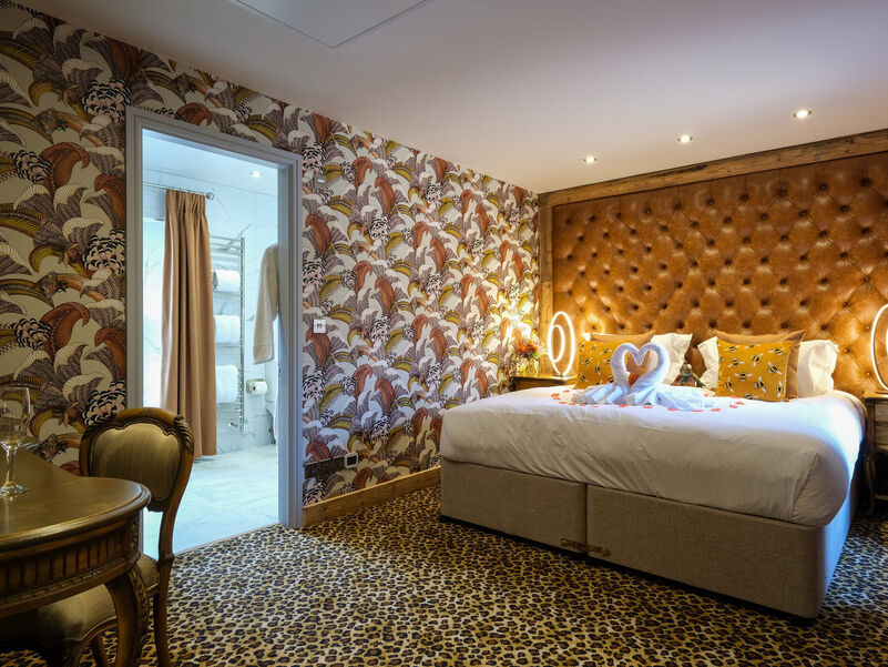 Welcome to Hampsfell Hideaway, an exotic and luxurious Junior Suite that brings together bold design and ultimate relaxation. The space features a striking Axminster leopard print wool carpet, elegant Cole and Son African Hoopoe wallpaper, and a handcrafted deep buttoned leather headboard wall, creating an atmosphere of warmth, adventure, and indulgence.